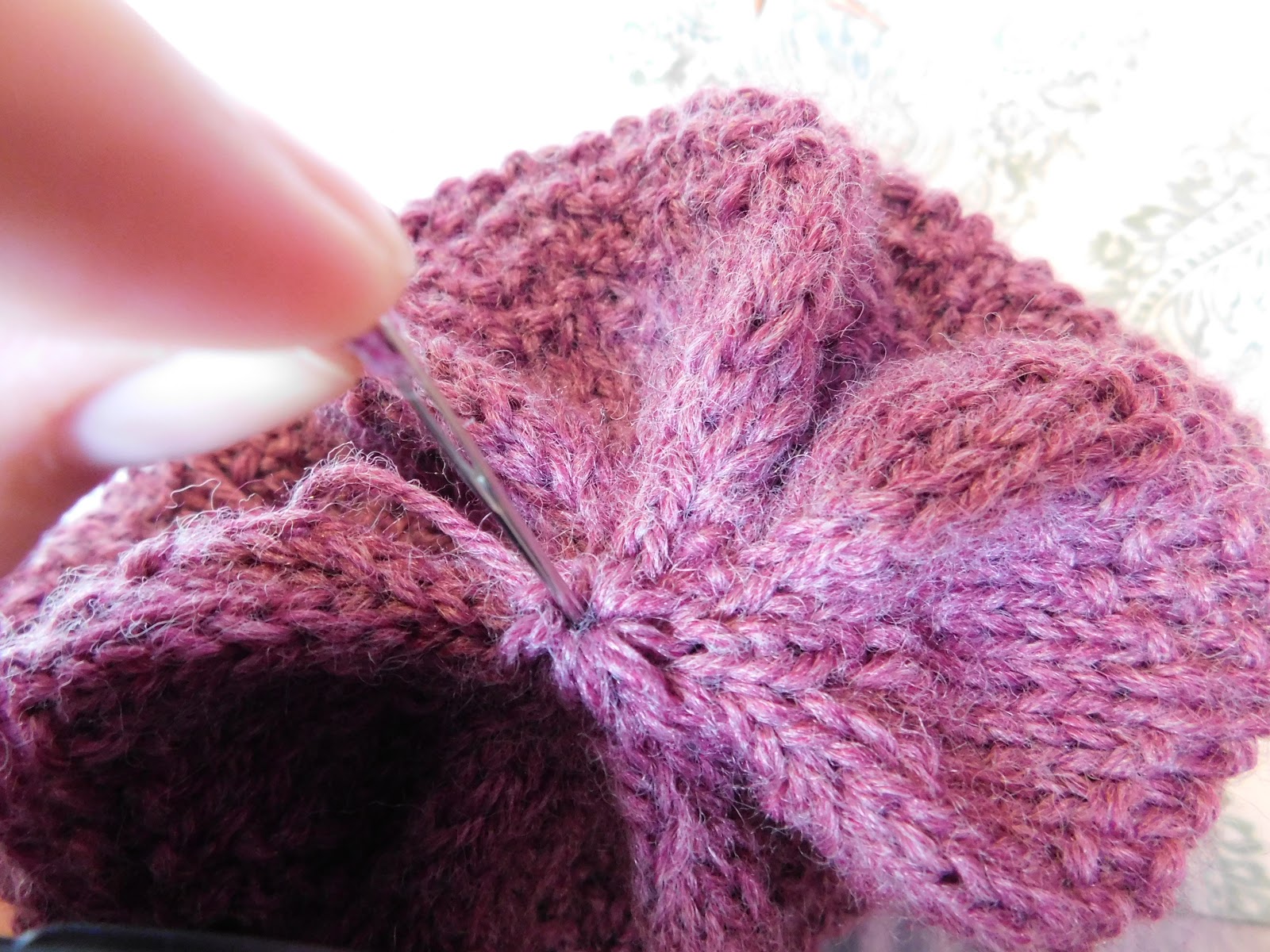Cut yarn leaving a tail long enough to pull through your remaining stitches. Using your yarn needle weave your tail through your remaining stitches so that when you pull the tail it will close the hole on the top. After the hole is closed pull the yarn through the center to the inside and then turn the hat inside out. Knot the hat at the top making it small since this hat is intended to be reversible. Then weave in the remaining tails.