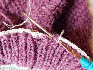 2 SC in each knit stitch, so that you have about 164 SC around the hat, and join with a slip stitch. Your number of SC does not have to be 164, but it does need to be divisible by 4, since the pattern is a 4 stitch repeat so 156, 160, 168 would work. If you do not have enough stitches around the work it will make it so the brim of your hat will not stretch and will give it snugger fit
